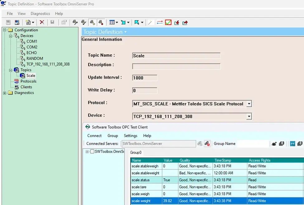 In the same plant, Mettler Toledo scales are used to weigh product as it comes off the production line. These scales lack a common communication protocol like Modbus, and traditionally, data was captured manually by operators with the use of a proprietary screen. Using the visual editor within OmniServer, the device specific protocol was implemented without writing any code, allowing the direct integration of scale data into the HMI system, a feat previously unachievable on its own. This same data is being read by Canary using OPC.