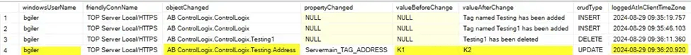 As an example, let’s say you begin to encounter a loss of data for a specific tag in your client application that is connected to your TOP Server beginning at 9:36 AM on 8/29/2024. With the audit log enabled, you can go check and see that User: bgiler changed the Tag Address of the AB ControlLogix.ControlLogix.Testing.Address from K1 to K2 at 9:36 AM on 8/29/2024 which must be a bad address (as shown in the image below). This information will help you address the issue promptly by consulting with the user to understand whether the change was intentional and if further adjustments are needed. There are countless different use cases, but this should help highlight the usefulness of the Audit Trail.