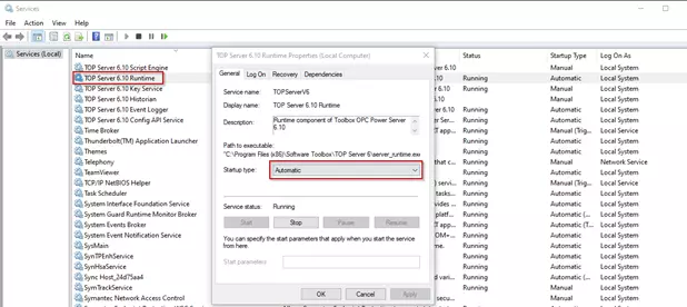 However, if a user wants to change how the TOP Server Runtime services starts, they can do so by changing the “Startup type” in the service’s properties in the Windows Services Console: